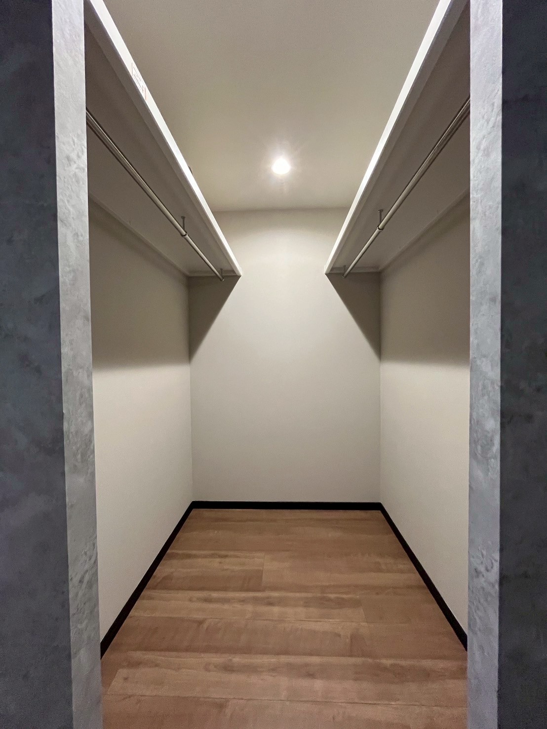 ウォークスルークローゼットではありませんが、キッチンから寝室まで直線で繋がる導線は、風通しも良く効率的。家族全員分の衣類は勿論、普段使わないものなどたくさん収納でき、使い勝手が良さそうです。