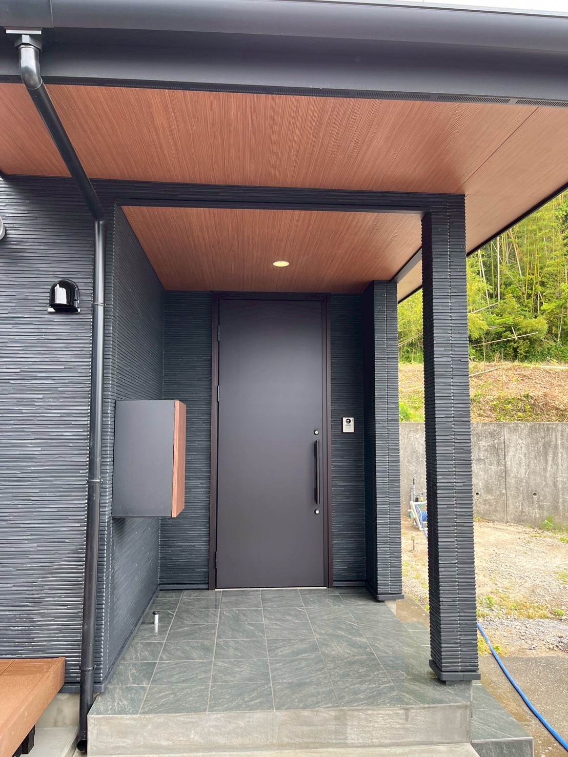 シックなダークグレーの外壁と、温かみのある木材のコントラストが美しい玄関ポーチ。