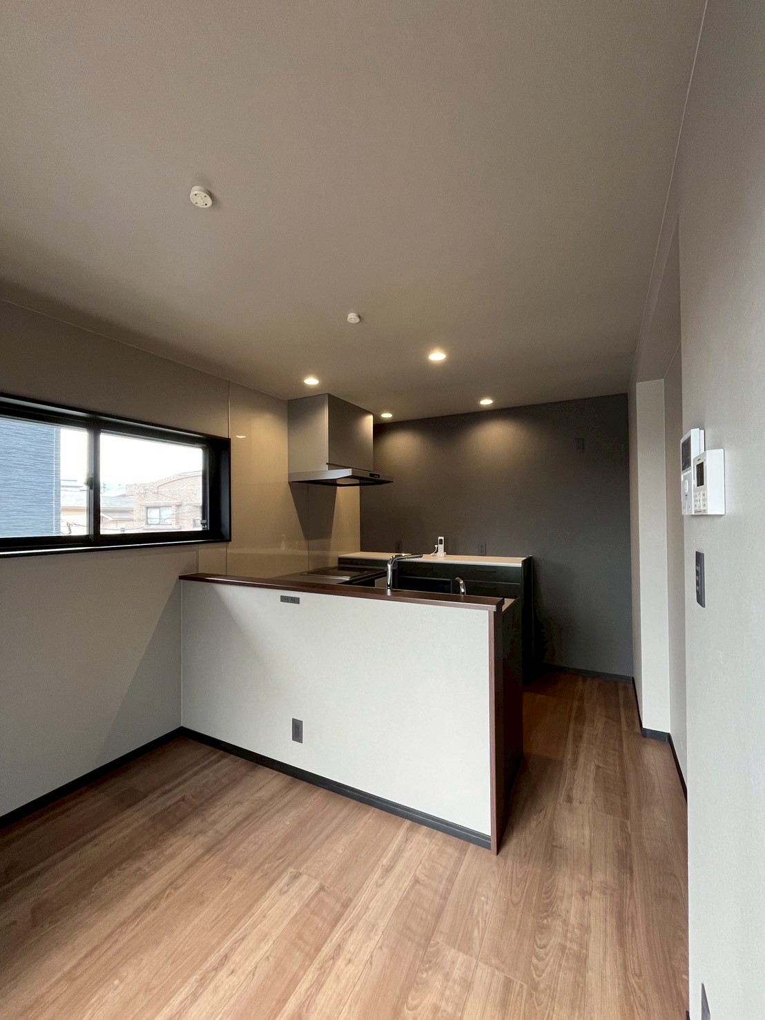 また、インテリアにも力を入れて、水回りや建具はブラック、部屋全体のクロスはグレー系にまとめ、落ち着いた空間に仕上がりました。アクセントクロスやライン照明、調光付きダウンライトを各所に設け、雰囲気も楽しめます。